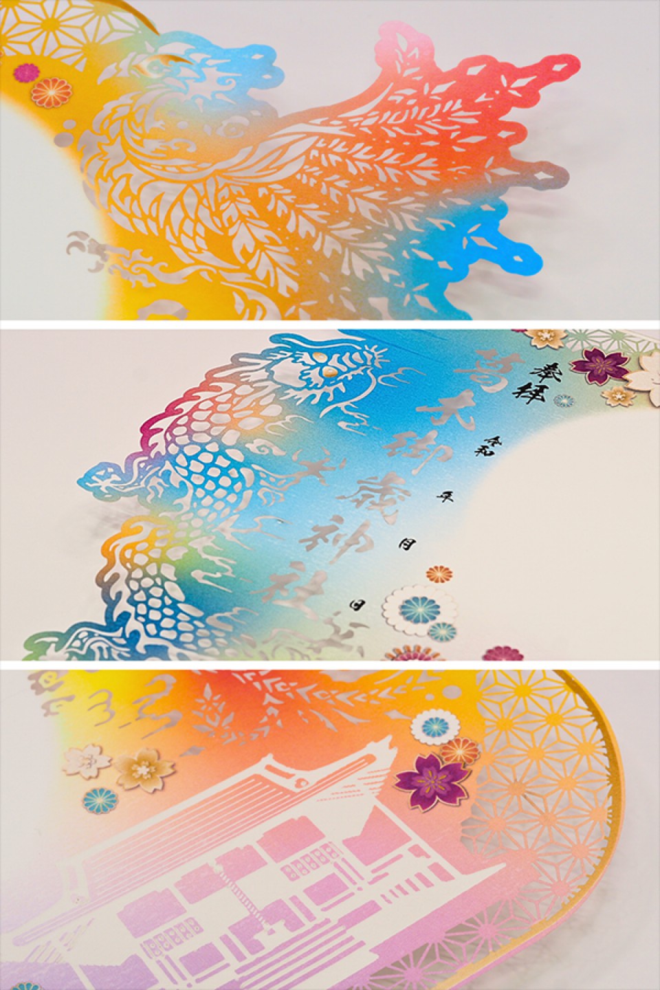 レーザーカット彫刻が生む繊細な立体感 今回の御朱印では、紙の一部を切り抜くことで、切り絵のような繊細なデザインを施しました。 背景が透けることで奥行きが生まれ、光や影の変化によって表情が変わる仕上がりは、まるで神聖な空間を映し出すかのような、細やかなデザインです。 御朱印に新たな魅力を加えています。 さらに、神社の建物をモチーフとした部分には、レーザーカット彫刻によるハーフカット加工を採用。 精密な彫刻によって立体感が生まれ、指で触れるとその繊細な質感を感じることができます。 こちらもご覧ください ▶レーザーカッター~精密な形状と独創性を引き出す