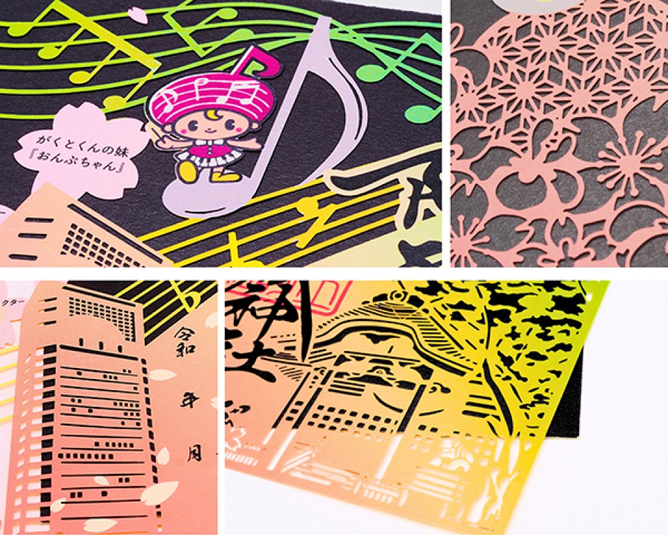 デザイン × 技術が生み出す、“手にしたくなる御朱印” SPECUEの高度なレーザーカット技術により、御朱印の細部に至るまで精緻なデザインが施されています。特に、黒の台紙を背景にすることで、切り絵の繊細さが際立ち、立体感や奥行きを感じさせる仕上がりとなっています。 大胆な曲線と細やかな線のバランス。 重ねた紙が織りなす立体感。 表情豊かな色彩設計。 それらすべてが一体となって、ただの記念品ではない、「旅の体験そのもの」となる一枚を実現しました。 こちらもご覧ください ▶メタリックプリンター~Iridesseイリデッセによる魅力あふれる印刷体験 ▶レーザーカッター~精密な形状と独創性を引き出す