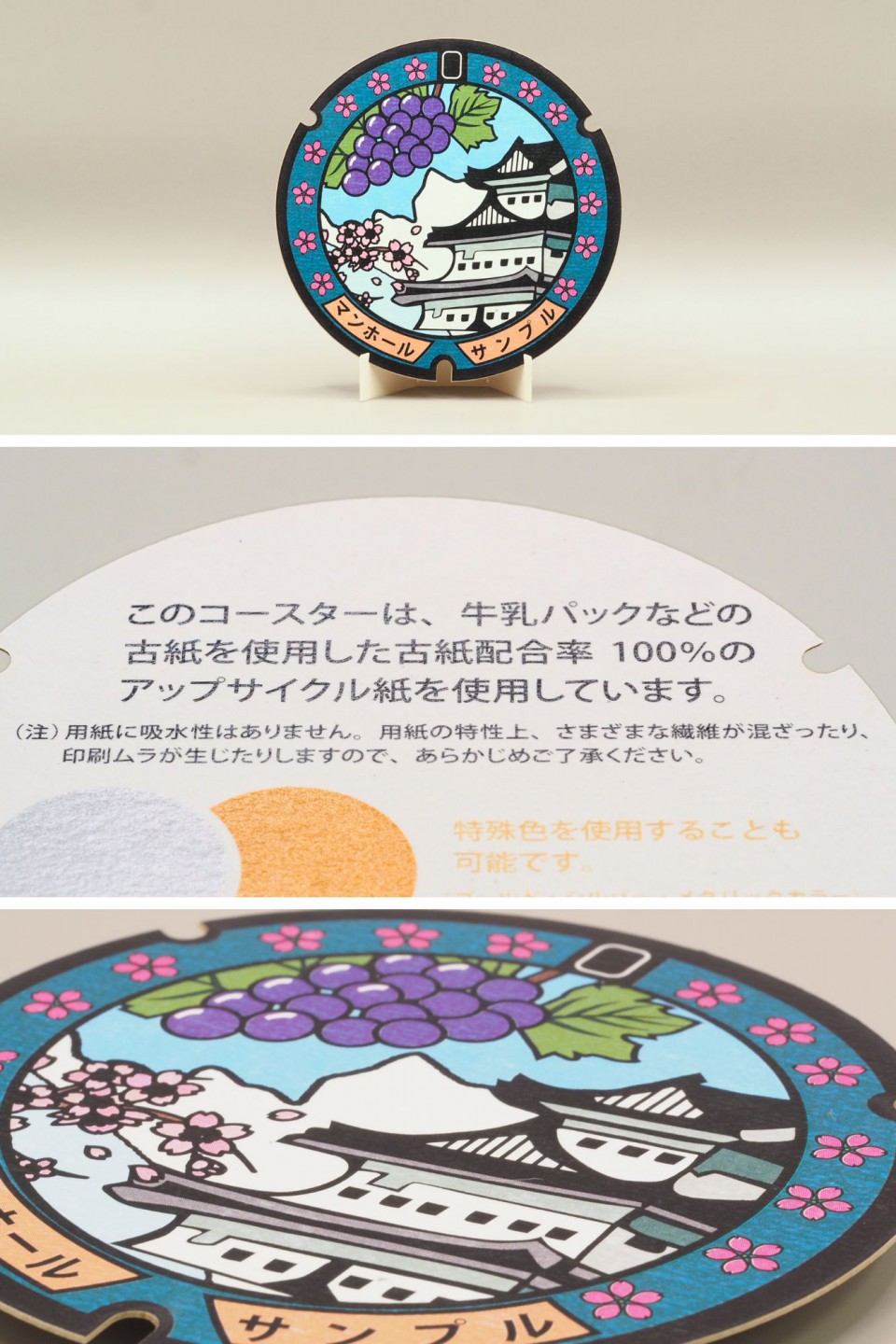 SPECUEでは、自治体様が保有するマンホール蓋のデザインを活かし、牛乳パックなどの古紙を再利用したアップサイクル紙(古紙配合率100%)を使用。環境にも配慮した、地域PRや啓発活動に活用できるオリジナルコースターを製作しています。