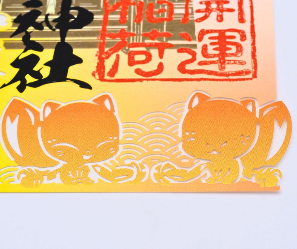 繊細な狐のシルエット 御朱印下部の狐は、レーザーカットによる細やかな抜き加工で表現しています。 特に目や耳のラインは、わずかな差で印象が変わるため、パスデータの精度やカット順に注意を払いました。切り抜き後も形状が崩れないよう紙厚や強度を計算し、安定した仕上がりを追求しています。 こちらもご覧ください ▶特殊印刷加工設備 Equipment | レーザーカッター~精密な形状と独創性を引き出す