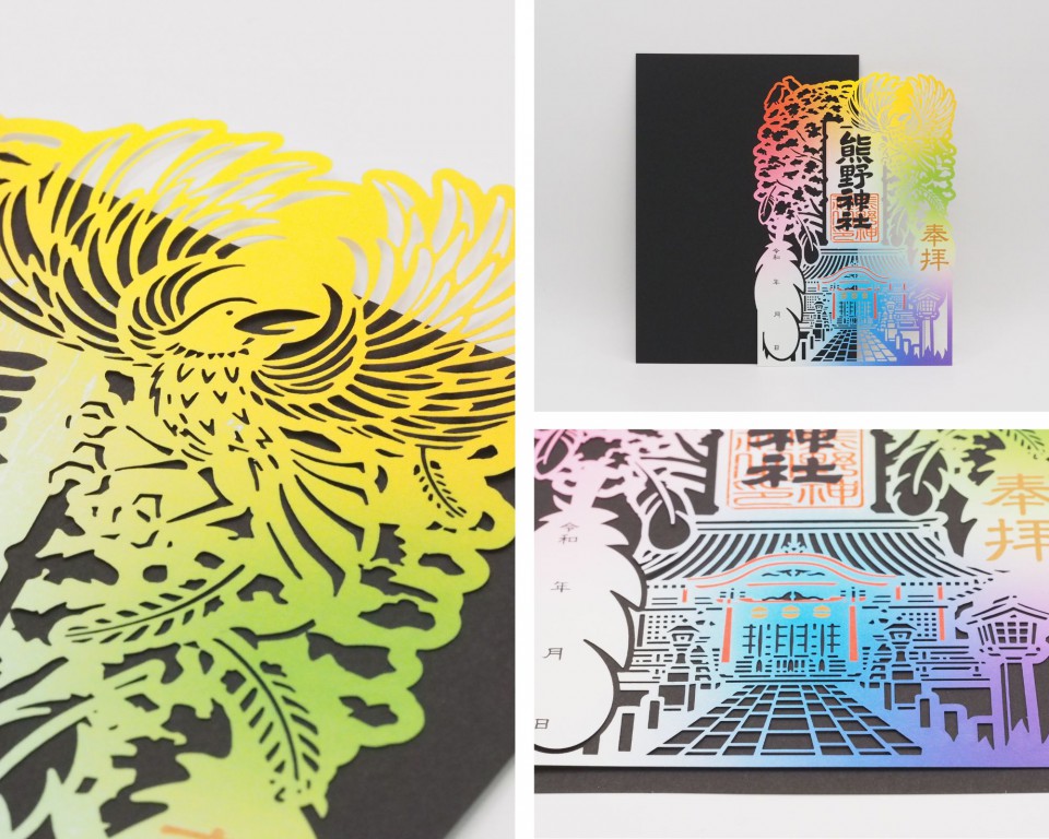 八咫烏と鳥居が描く物語 大牟田熊野神社様の切り絵御朱印「八咫烏」は、神社の象徴をやさしく紙面に映し出しています。 導きの神とされる八咫烏の姿と、鳥居の奥に拝殿を望む景色が重なり、参拝の情景そのものを表現しました。 付属の黒い台紙を重ねると、八咫烏の輪郭が際立ち、御朱印全体がより深みを増して映ります。 こちらもご覧ください ▶特殊印刷加工設備 Equipment | メタリックプリンター~Iridesseイリデッセによる魅力あふれる印刷体験
