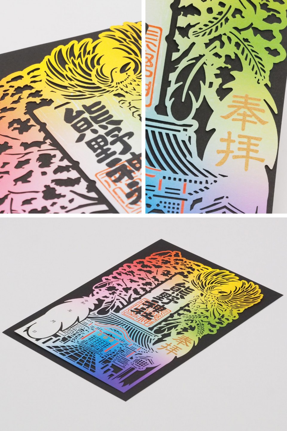 ひとつひとつに宿る繊細さ この御朱印の魅力を引き立てているのは、レーザーカットによる緻密な切り抜きです。 鳥居の格子や拝殿の屋根瓦、羽を広げる八咫烏まで、細かな部分まで丁寧に表現されています。 光にかざすと影がやわらかく揺れ、角度によって新しい表情が見えるのも、この御朱印ならではの楽しみ方です。 ☞大牟田熊野神社様X / Instagram こちらもご覧ください ▶特殊印刷加工設備 Equipment | レーザーカッター~精密な形状と独創性を引き出す