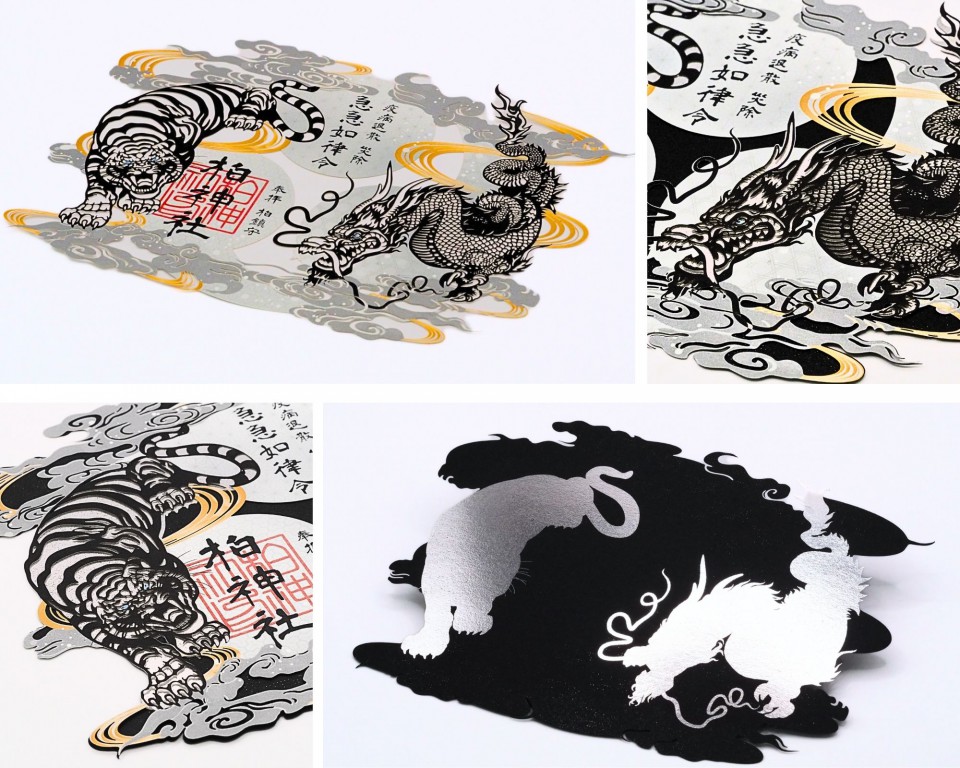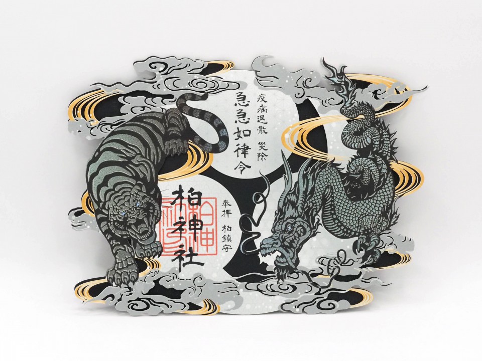2025/10/27 柏神社様/二枚重ね御朱印『タイガー&ドラゴン』 柏神社 千葉 虎 龍 御朱印 限定御朱印 御朱印界隈 実例 メタリックプリント レーザーカット ゴールド シルバー デジタル箔 SDGs kome-kami フードロスペーパー 再生紙 プレミア オリジナル 進化する御朱印 神社プロモーション SPECUE GOSHUIN red ink stamp