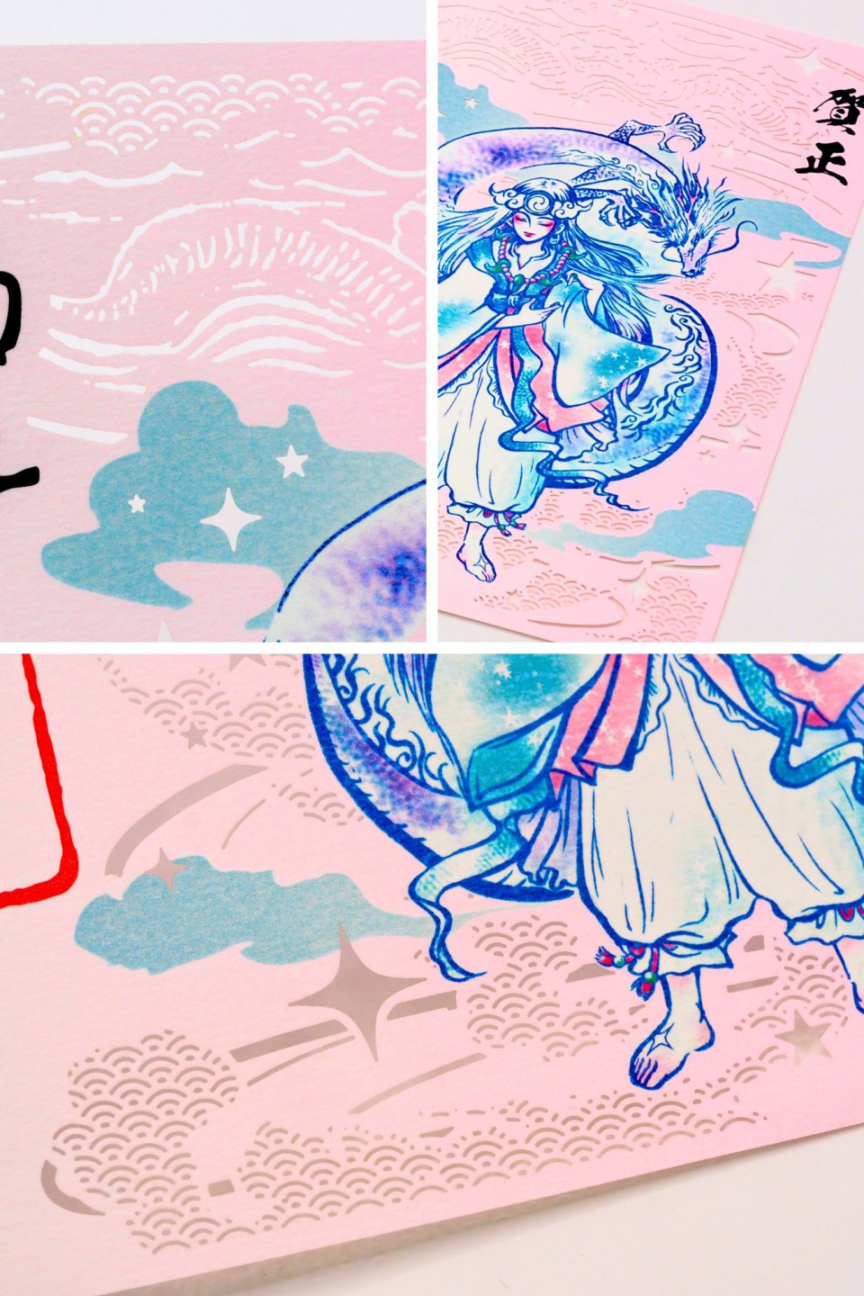 網戸神社様の御朱印制作では、やわらかな色調と繊細な切り絵表現を両立させることを重視しました。 プリント・用紙・レーザーカットを一体で設計し、御朱印としての可読性と造形的な魅力をバランスよくまとめています。 ☞網戸神社X ☞網戸神社Instagram