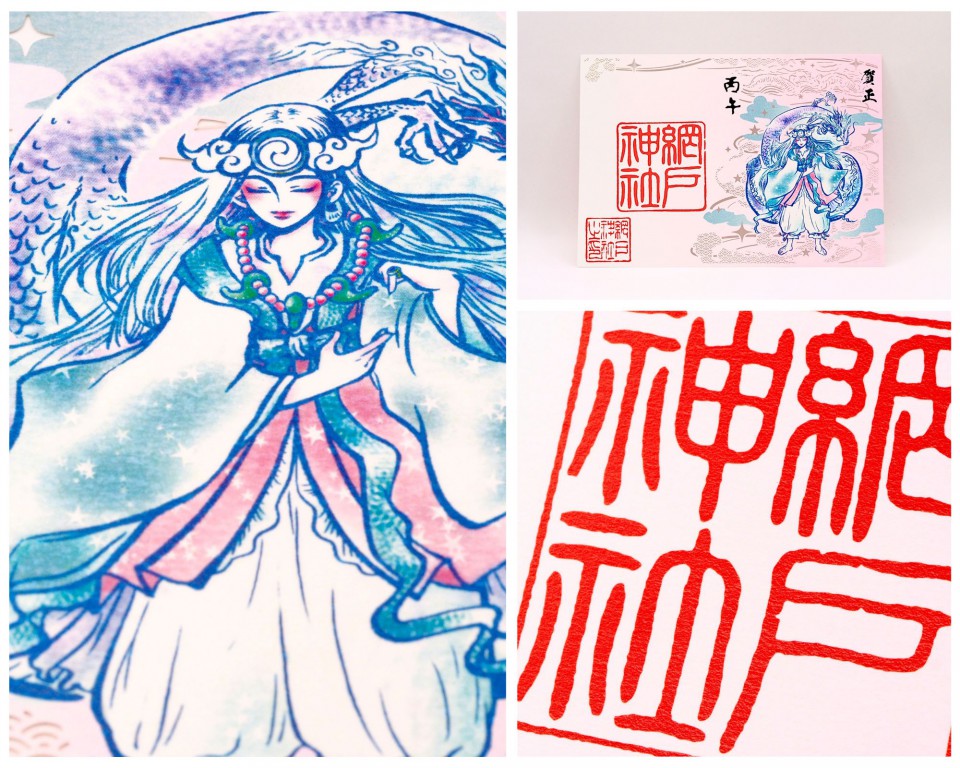 フルカラー+ピンクトナーによる色設計 プリントはフルカラーをベースに、ピンクの特色トナーを組み合わせた仕様です。 主祭神・田心姫命の姿を中心に、青系を基調とした落ち着いた配色でまとめています。背景や装飾に特色トナーを加えることで、全体にやわらかな華やかさを添えました。 用紙そのものの白さを活かす余白設計とすることで、色を重ねすぎず、御朱印としての品位を保った仕上がりとしました。 こちらもご覧ください ▶特殊印刷加工設備 Equipment | メタリックプリンター~Iridesseイリデッセによる魅力あふれる印刷体験