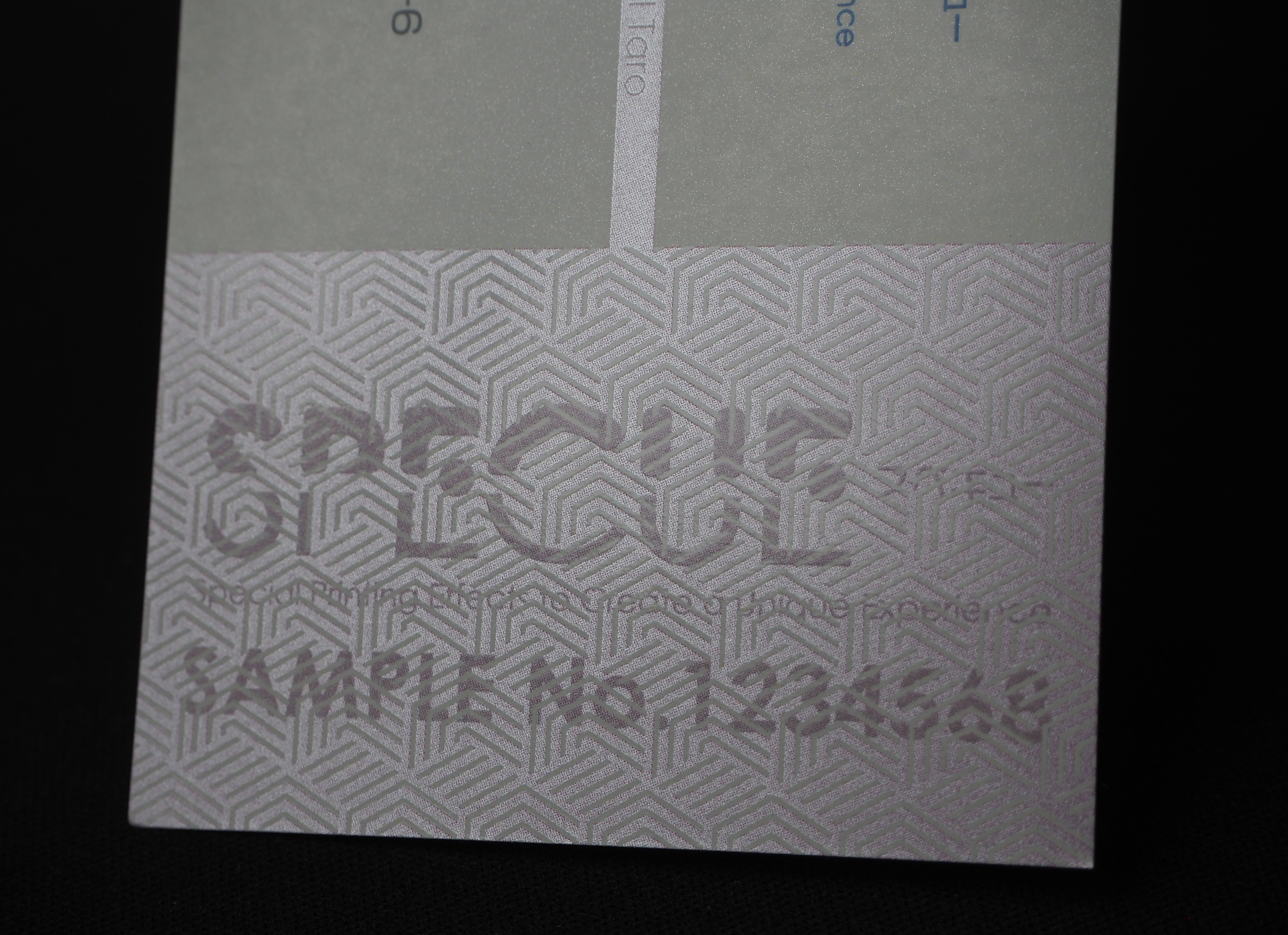ゴールド&シルバーメタリックの輝きを利用 ! この不思議な現象の秘密は、「ゴールドメタリック」や「シルバーメタリック」といった輝きのあるトナーと、クリアトナー、そして緻密なパターンデザインの組み合わせにあります。 メタリックカラーの光を反射する性質を利用し、背景のパターンと文字部分の線の太さや密度を絶妙に調整することで、「正面からは模様に見えるけれど、斜めから見ると文字が光って見える(あるいは影になって見える)」という視覚効果を生み出しています。 こちらもご覧ください ▶特殊印刷加工設備 Equipment | メタリックプリンター~Iridesseイリデッセによる魅力あふれる印刷体験