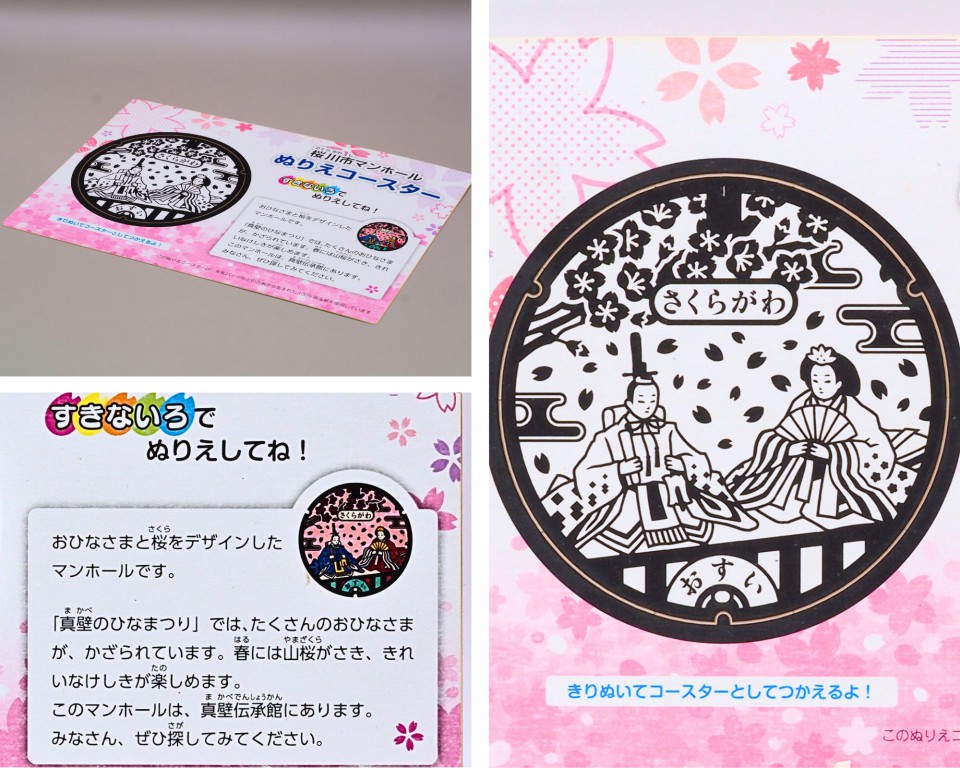 春を彩る「お雛様」と「桜」のマンホール 茨城県桜川市様からご依頼いただいたのは、市内のマンホールデザインをモチーフにした「ぬりえコースター」。 誰でも楽しめるぬりえコースターとして、デザインには真壁地区で毎年開催される「真壁のひなまつり」と、約55万本のヤマザクラが咲き誇る桜川市の春を表現しています。 線画を活かしたモノクロ印刷をベースに、好きな色を自由に塗り込める仕様で、お子さまから大人まで楽しめる地域PRグッズに仕上がっています。