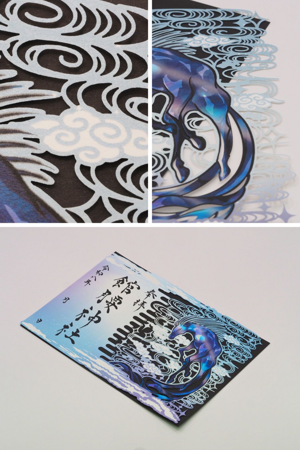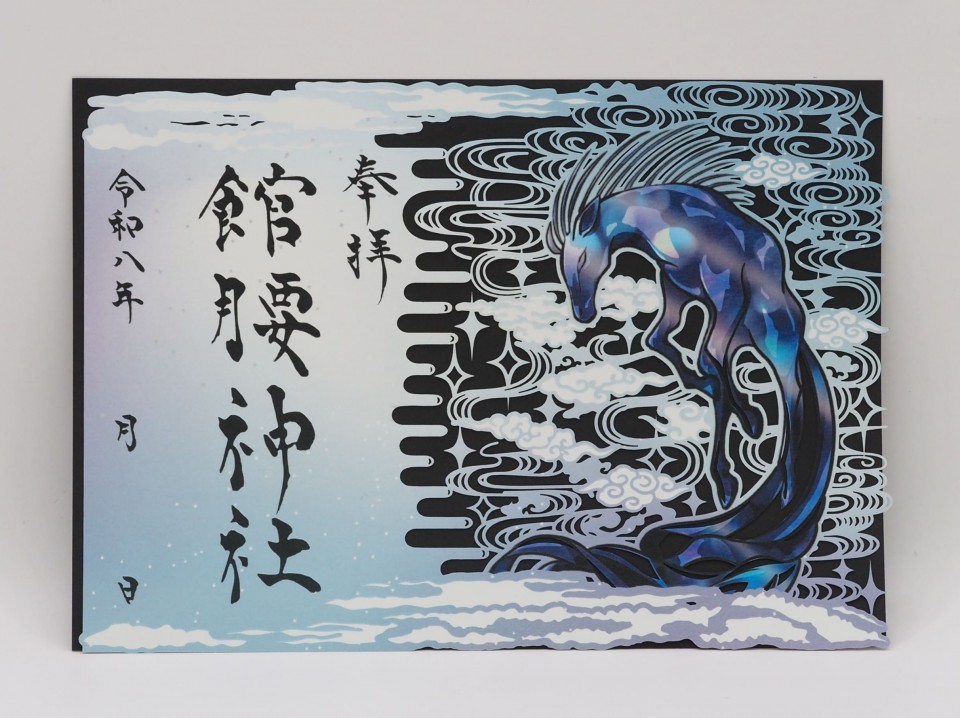 館腰神社様の御朱印を、SPECUEにて一貫制作いたしました。 午年にちなんだ馬の意匠と雲紋様を組み合わせ、印刷とレーザーカットを併用することで、奥行きのある画面構成に仕上げています。 フルカラーとシルバーメタリックの表現、そして黒台紙との組み合わせにより、コントラストと立体感を両立した一枚です。 ☞館腰神社X ☞館腰神社Instagram
