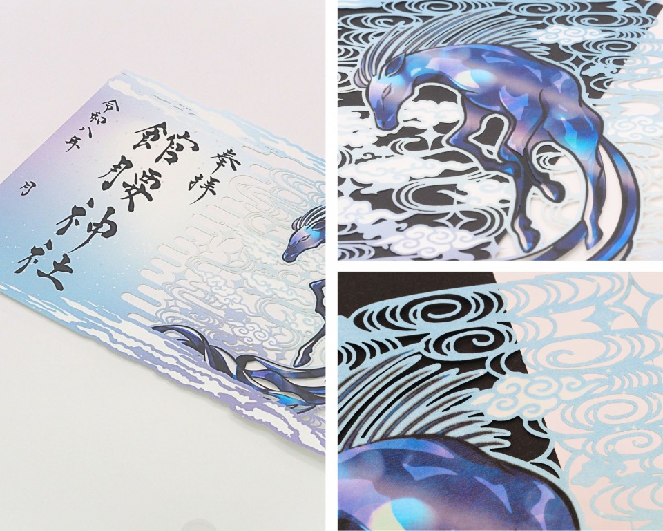 レーザーカットと黒台紙による抜けと陰影 背景の雲紋様にはレーザーカットを施しています。 紋様の一部を抜くことで、下に重ねた台紙の色が現れ、印刷だけでは出せない奥行きが生まれます。 本作では台紙にケンランブラックを採用しており、カット部分から見える黒が画面全体を引き締め、馬の色彩やシルバーメタリックの表現をより際立たせています。 また、細線が連続する部分でも強度を保てるよう、カット幅や配置を調整し、安定した仕上がりとしています。 こちらもご覧ください ▶特殊印刷加工設備 Equipment | レーザーカッター~精密な形状と独創性を引き出す